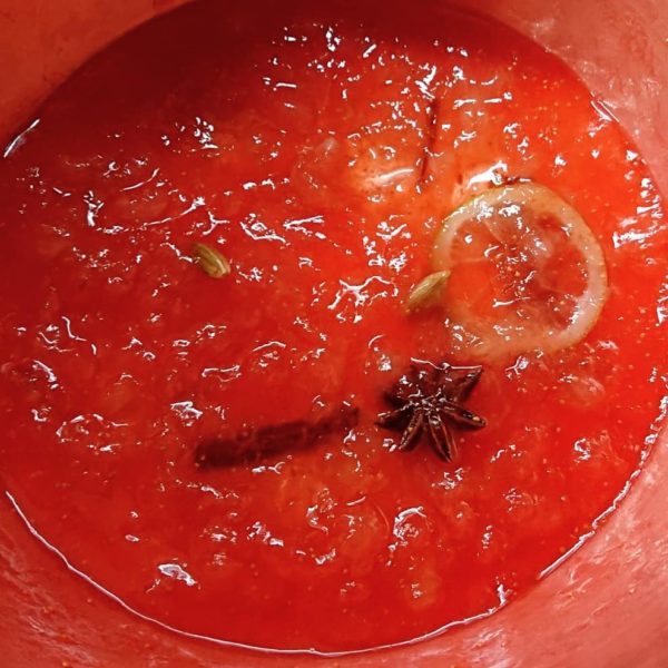 真っ赤でツヤツヤに炊き上がりました。イチジクのきれいな色とジャムのかたさを出すには砂糖を多目に加えるので、その分スパイスやレモンのパンチを効かせて大人味に仕上げます。熟成させてクリスマス頃に食べるのも美味しいですね🎵