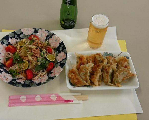 餃子、ご馳走そうめん、リンゴゼリーのビール風