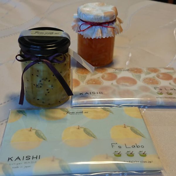 いままでは、越前和紙で感じのよい物をジャムにかけていたのですが、オリジナルの物が出来ないかしら?とおもっていたところ、オーダー懐紙を作ったいただけると知り利用させて頂いています。
