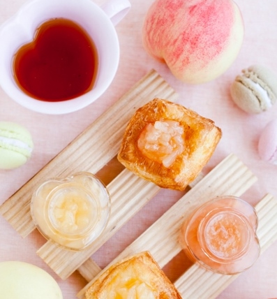 夏にいただくゆずジャムソーダ。クリスマスの時期の桃ジャムムース。今の時期の青梅ジャムパン。