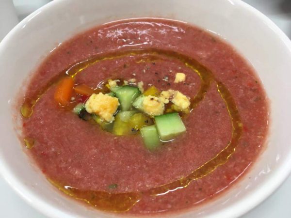 ガスパチョとはスペインの冷たいトマトのスープで、材料をミキサーにかけるだけの簡単なものなのですが、