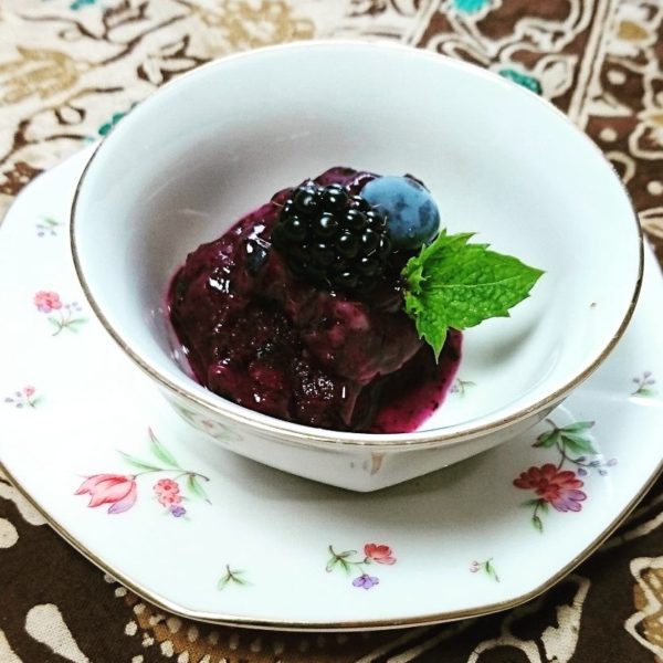 デザートは甘麹と冷凍しておいた自家栽培ブルーベリーで甘麹アイスです。これはフードプロセッサーなどで混ぜるだけで超簡単です。夏の紫外線で傷んだお肌の修復にもばっちりです!!